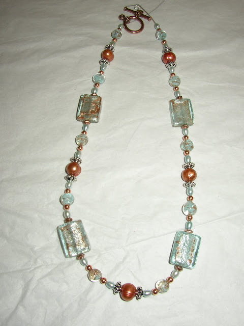 I liked it even better when I paired the Czech glass with copper-coloured dyed pearls, blue pearls, sterling and copper beads, Venetian glass and copper clasp. Yeah, I kept this one.