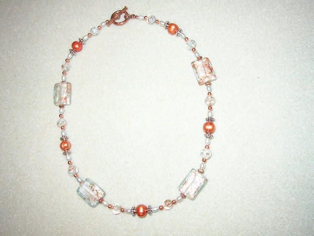 I re-made the white glass necklace with copper-toned pearls and Venetian glass; accents are silver & copper beads, small pearls, and copper clasp. Funny how the big pearls and the Venetian rounds make it so much more sophisticated.