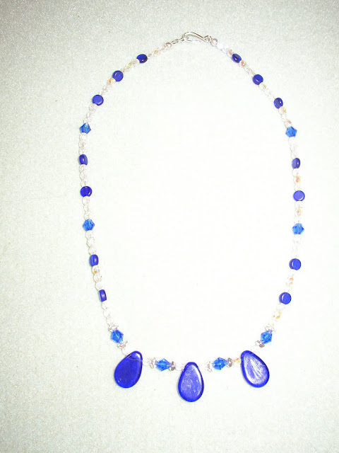 I had a bunch of cobalt blue beads in numerous shapes; I love cobalt blue. I tried pairing drops, bicone crystals and flat round glass beads with crystals and sterling spacers and crystals. I liked it when I made it. Three months later I hated it so much I took it apart and still haven't done anything with the components.