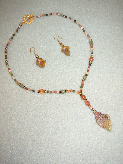 This was my first; a gift for my sister. I found the glass shells at a bead show. The beads are jasper and the clasp is gold.
