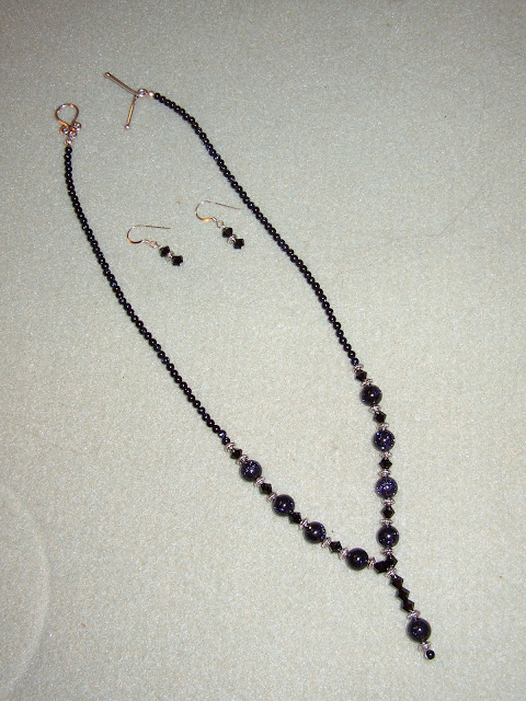 Goldstone is a man-made semi-precious gemstone. Originally invented in the alchemic quest for making gold from other natural materials, it was made nearly exclusively by an Italian family, its recipe handed down through the generations. It comes in several colors, usually seen in a warm brown. I favour the dark blue with its silver glints.I liked them so much I made a few for myself.:)