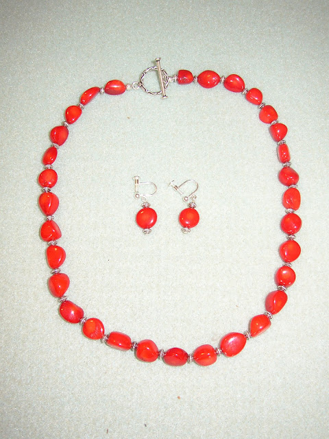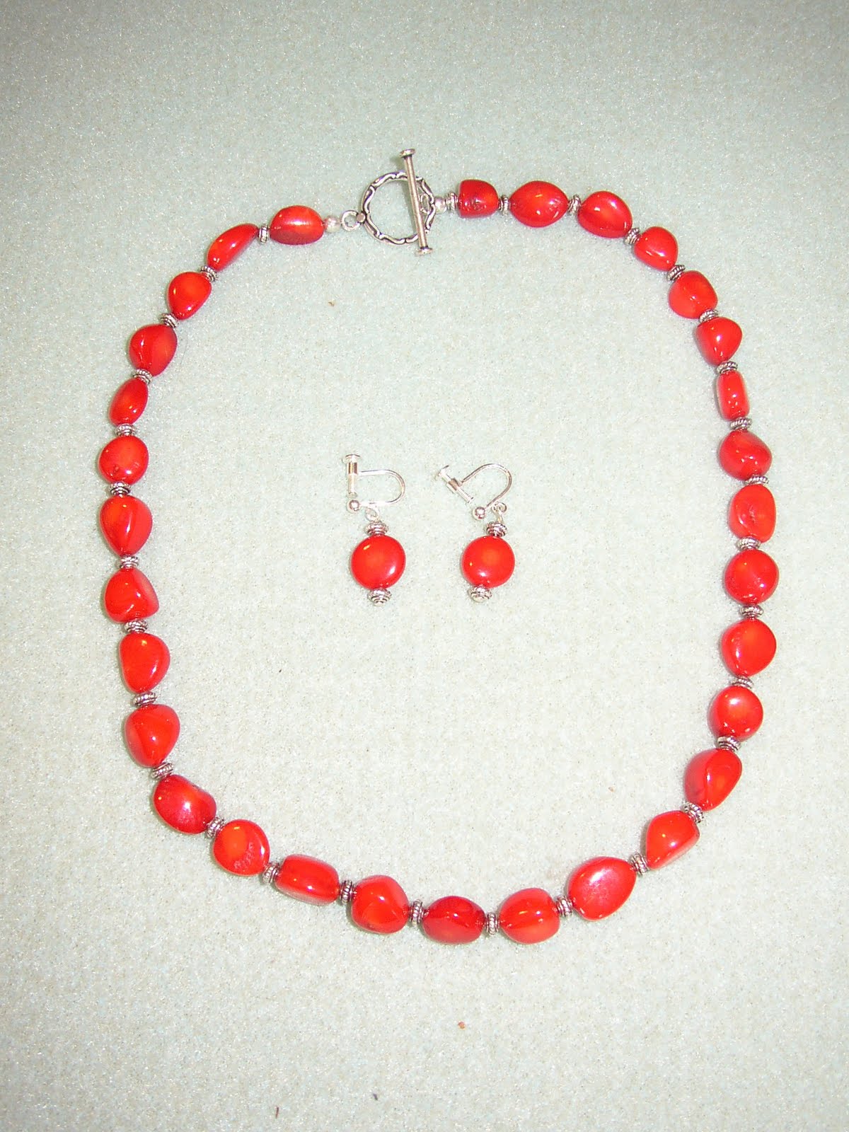 This is a coral and sterling silver simple necklace I made for my friend to go with her dress of white with black flower print. I call it Wilma.